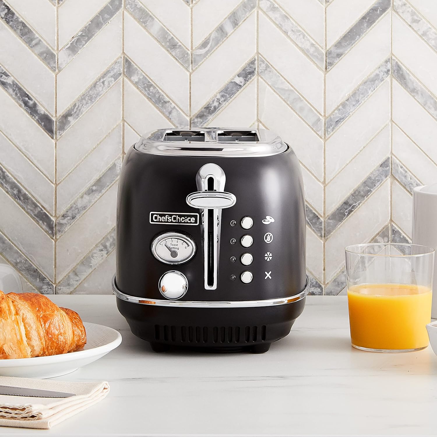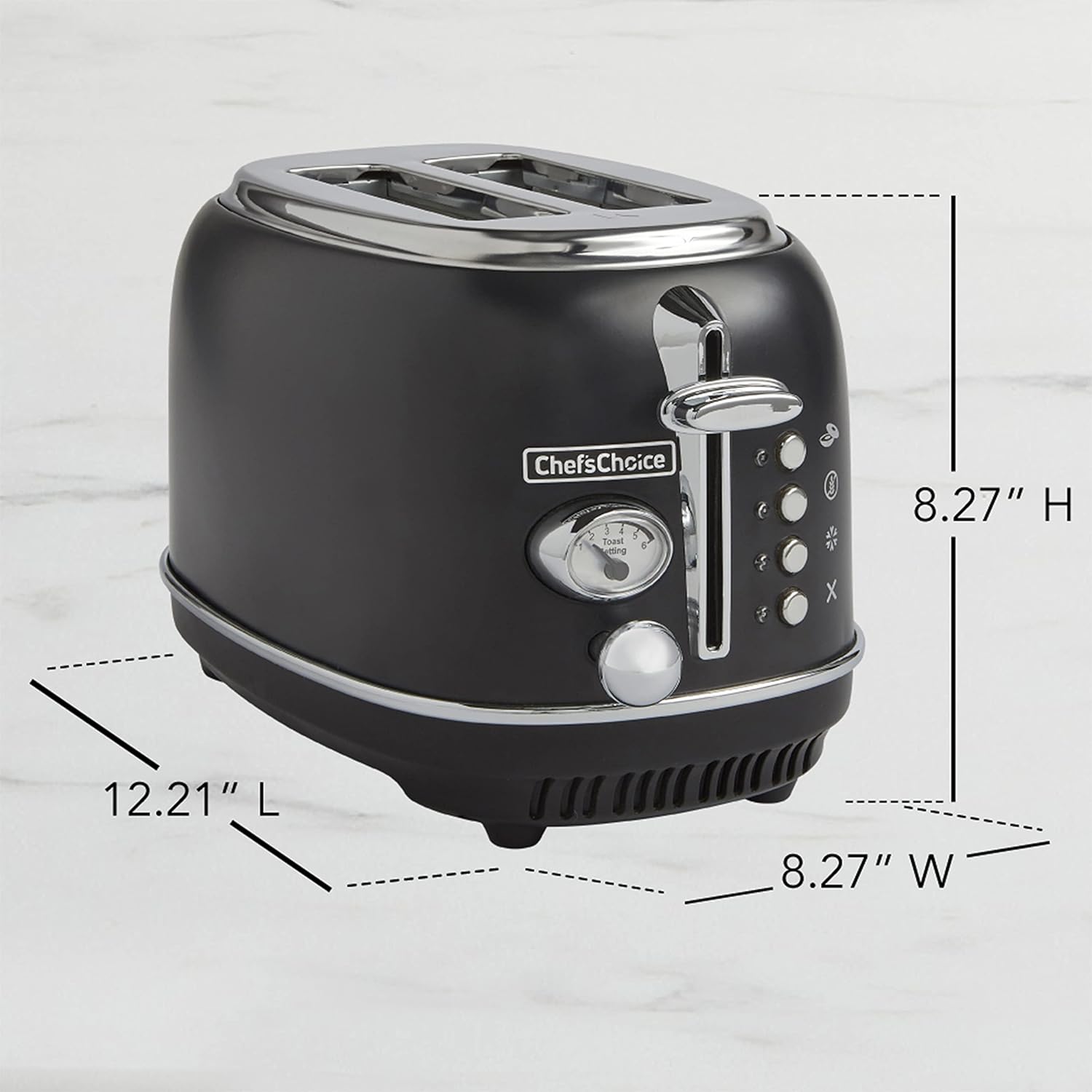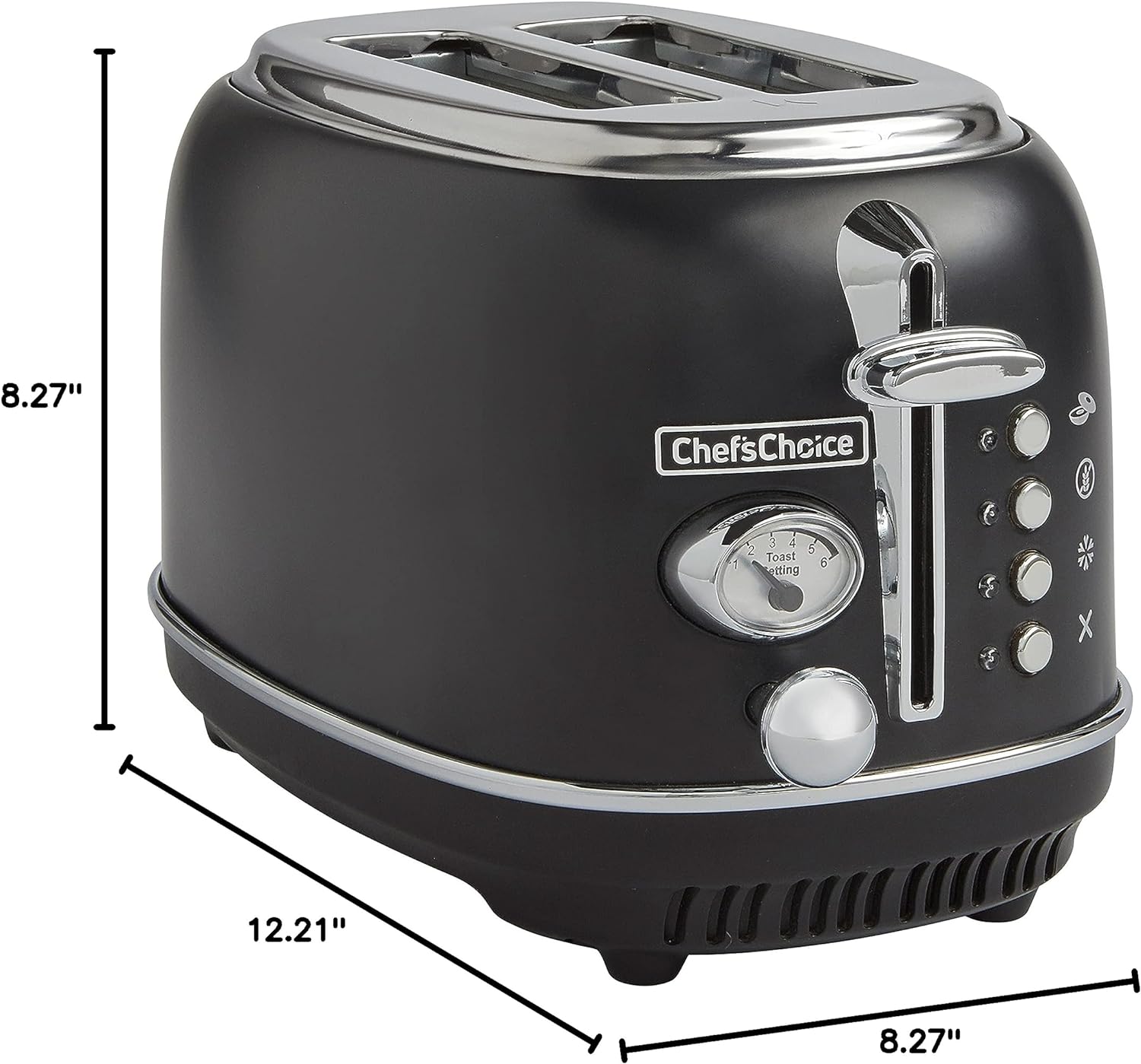 The Chef'sChoice Gourmezza 2 Slice Toaster steps up your style in the kitchen with a matte black finished body and chrome accents. The premium stainless steel of this toaster not only delivers great looks, it also gives you the confidence to know that it is sturdy and well-constructed. Its chrome toast lift gives you an easy grip half in. lift to effortlessly raise food that is being toasted. The extra wide toast slots comfortably fit your favorite breads, croissant, bagels, waffles and more! The no-guess 5 function system provides the ideal cook time and temperature control for Toast, Bagels, Gluten-Free and Defrosting. For your convenience, you can use the Cancel function to stop the toasting process at any time. Customize toasting just the way any member of your family likes it, with 6 shade settings that enable you to choose your toasting preference from light to dark. The onboard cord storage neatly keeps cord wrapped and out of sight. Clean up is a breeze with the easy access crumb tray that catches crumbs to help alleviate any mess. Slip resistant feet for stable and secure operation.