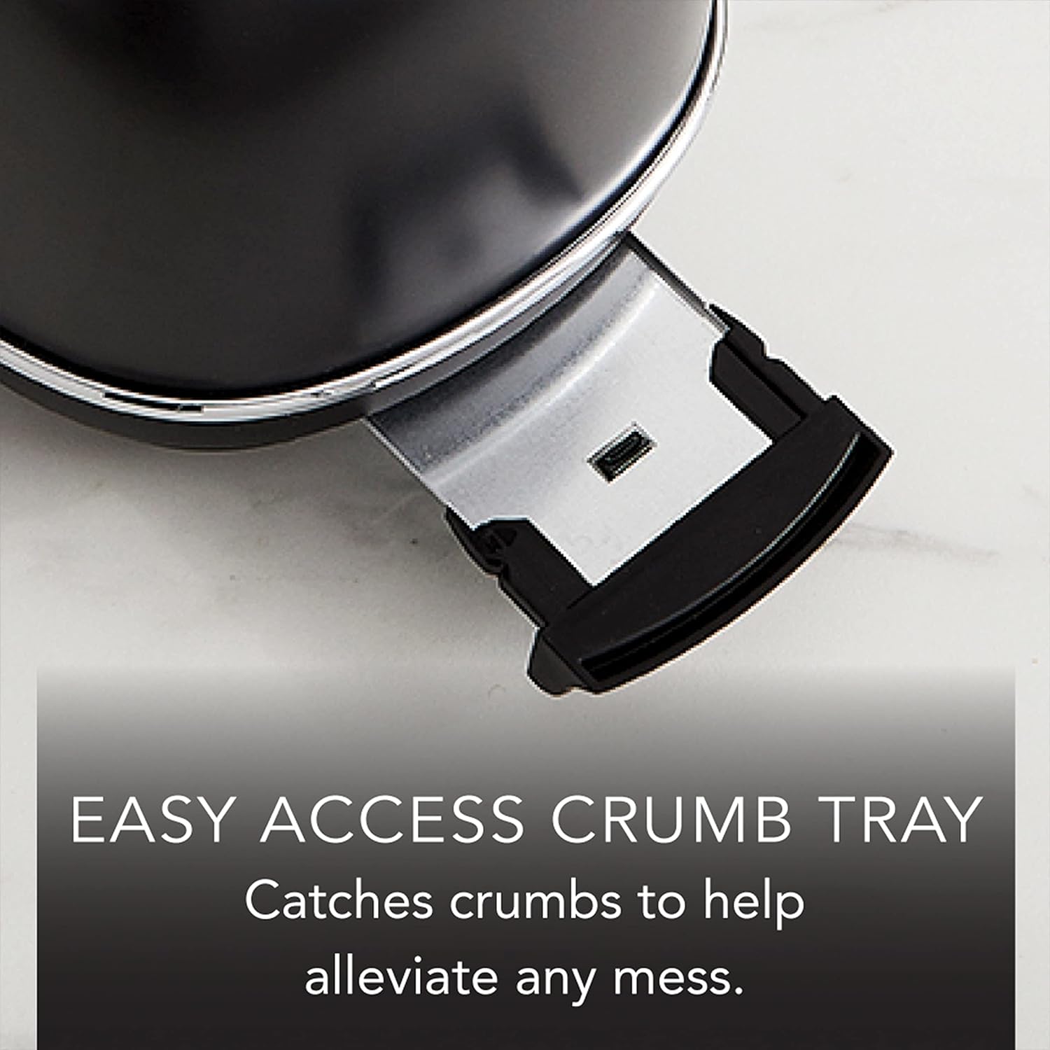 - Easy access crumb tray catches crumbs for no-mess clean up