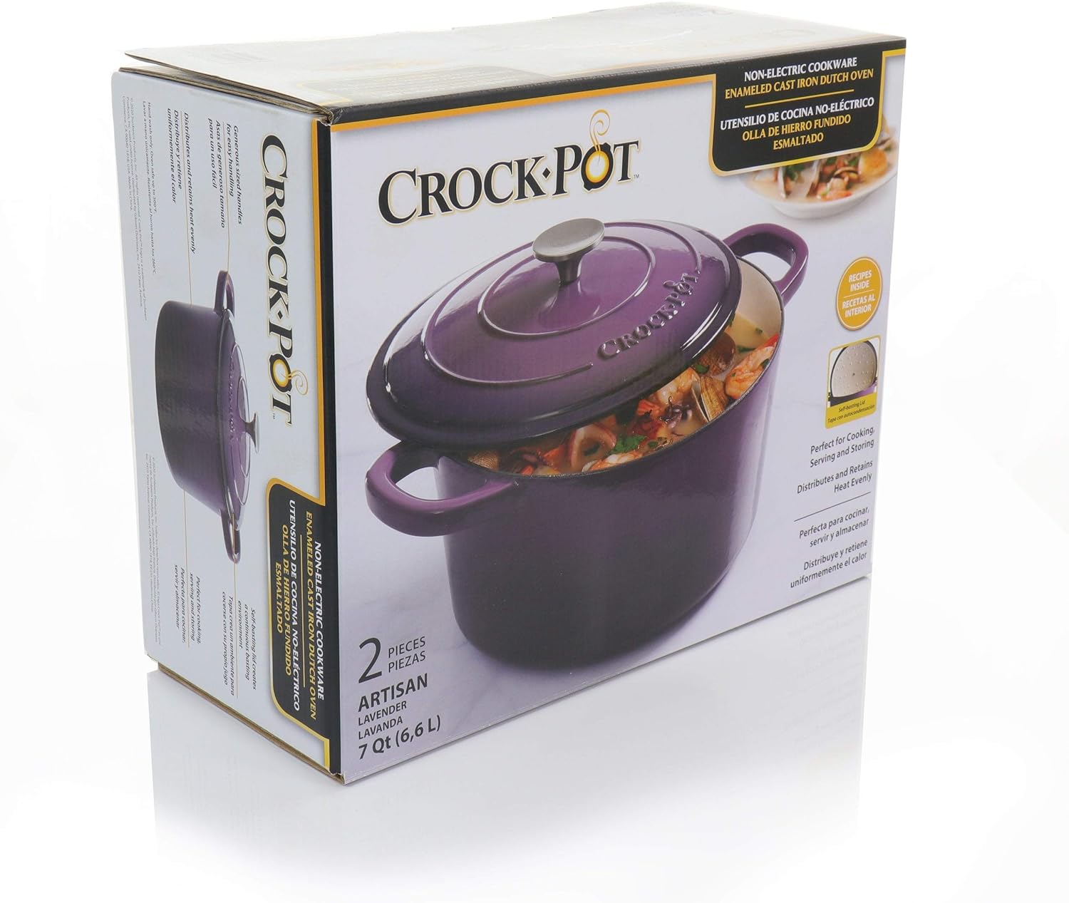 Take your at -home cuisine to the next level with the Crock-Pot Artisan 2-Piece 7 qt. Enameled Cast Iron Dutch Oven with Lid in Lavender. This essential kitchen tool is crafted from quality enameled cast iron, making it strong and durable enough to handle all your culinary creations. This dutch oven comes with a self-basting lid to make your cooking experience even easier. This non-electric cookware distributes and retains heat evenly. making it perfect for cooking, serving and storing your meals.