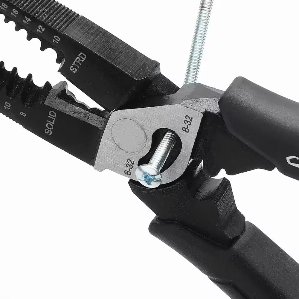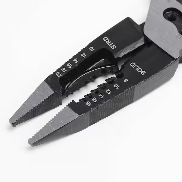 The 8 in. 6-in-1 Multifunction Pliers are ideal for working in tight spaces. They feature a long nose design for good performance as long nose, but also as a Spanner socket opening for gripping nuts and bolds. Non-slip gripping power, and heat-treated side-cutting knives for strength. Stripping function strips 8-AWG to 18-AWG solid and 10-AWG to 2- AWG stranded copper wire. Perfect for the home, workshop or jobsite.