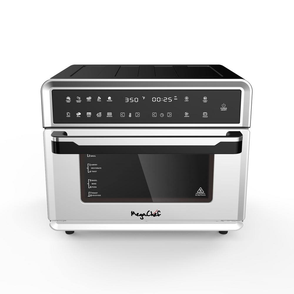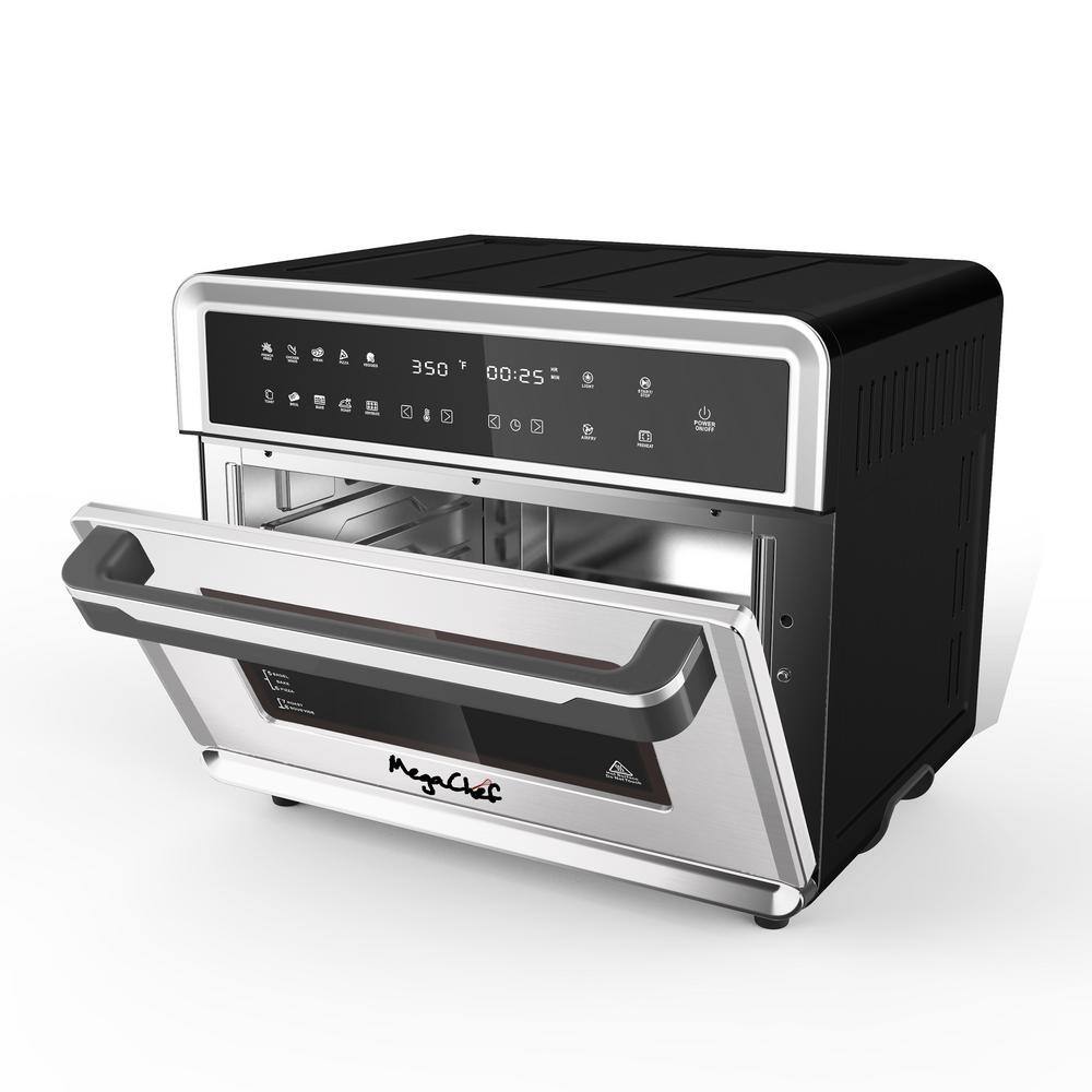 With the MegaChef Electronic Multi-functional 360 Degree Hot Air Countertop Oven, you can do so much more. Beautifully engineered design has convenience and precision in mind with 10 preset functions that will take the guessing game out of cooking. Extra versatile Digital Touch Display and 10 preset functions: French Fries, Chicken Wings, Steak, Pizza, Vegetables, Toast, Broil, Bake, Roast and Dehydrate. Powerful 360 Degree hot air circulation technology for faster and more even cooking. Six heating elements cook food evenly by circulating hot air within the oven up to 40% faster for more efficient and more healthier cooking. Large 25L size capacity for whole chicken and frozen pizzas, but sleek and compact to complement any kitchen. Easy cleaning with the nonstick interior and removable bottom.
