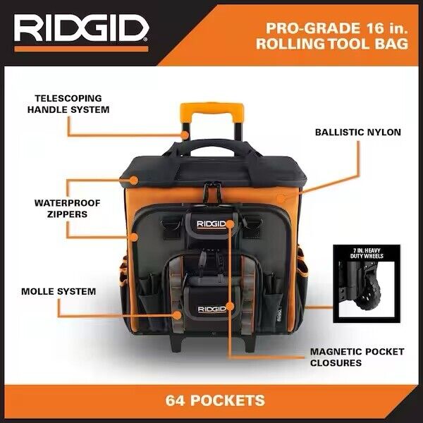 The RIDGID 18 in. 44 Pocket Professional Grade Tool Bag is perfect for the jobsite, garage or home for maximum tool storage. Built with 2x strength ballistic nylon, this tool bag features waterproof zippers, magnetic pocket closures for easy accessibility. The rugged design is constructed with 840 denier, includes an integrated MOLLE systems, and a rugged molded base to combat any harsh conditions that you may encounter on the jobsite. It also features quick access stay-put handles for efficiency and easy convenience. Equipped with 25 inside pockets and 19 outside pockets, this tool bag is idea for carrying tools, hardware, small parts, and more. Be sure to add the RIDGID 18 in. 44 Pocket Professional Grade Tool Bag to your tool storage collection today.