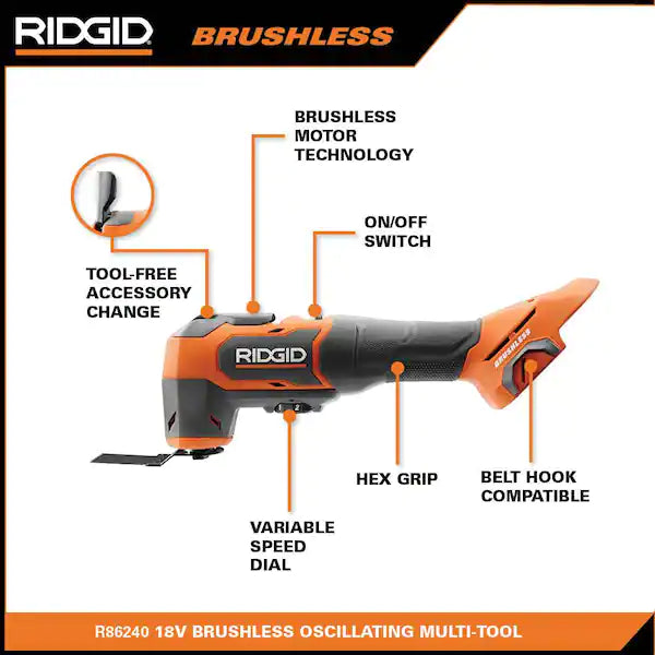 RIDGID introduces the R86240B 18V Brushless Oscillating Multi-Tool. RIDGID's brushless motor technology delivers maximum performance and longer runtime. The powerful brushless motor in this 18V oscillating multi-tool gives users the ability to make fast, precise cuts through drywall, wood, metal, and handle a variety of other jobsite materials. The RIDGID 18V Brushless Oscillating Multi-Tool delivers up to 20,000 oscillations per minute (OPM) and is controlled by an easily accessible variable speed dial giving users ultimate control to match speed to any application. Built with maximum productivity in mind, this 18V brushless oscillating multi-tool features a tool-free accessory change design and is compatible with the most multi-tool accessories. As always, this RIDGID 18V Brushless Oscillating Multi-Tool is 100% compatible with all RIDGID 18V batteries. The R86240B includes the Brushless Oscillating Multi-Tool, Sanding Pad, Saw Blade, Wood Cutting Blade, Sandpaper and Operator's Manual. Batteries and charger sold separately.