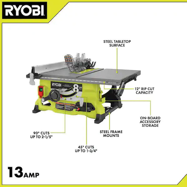 RYOBI introduces the 13 Amp 8-1/4 in. Table Saw. This table saw is lightweight and easy to use, making it a great addition to any tool collection. Powered by a 13 Amp motor, it can generate up to 5600 RPM for powerful cutting and the 25 in. x 17 in. table provides support for large ripping operations. The saw also features an adjustable miter gauge for accurate cross cutting. the 13 Amp 8-1/4 in. Table Saw includes an 8-1/4 in. blade, blade wrenches, a hex key, anti-kickback pawls, a blade guard assembly, a push stick, a miter gauge, a rip fence, and an operator's manual.