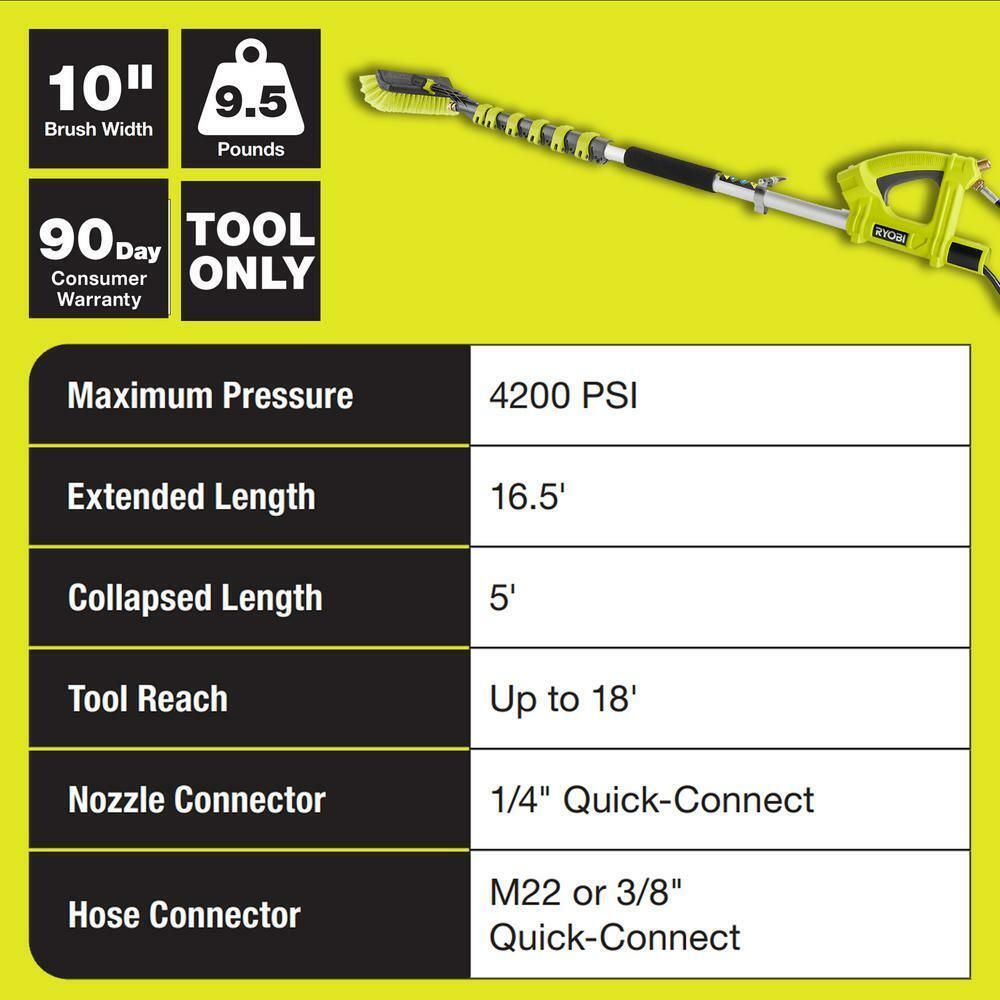 The RYOBI Telescoping Extension Pole is the perfect accessory for those hard to clean places. The pole telescopes using locking levers, so you can adjust to the perfect length giving you reach up to 18 ft. The tool is lightweight and features an ergonomic handle with in inverted trigger, which relieves pressure on your hand and fingers. with the included brush attachment, you can clean a variety of surfaces with ease. The RYOBI Telescoping Extension Pole is compatible with most electric and gas pressure washers up to 4200 psi.