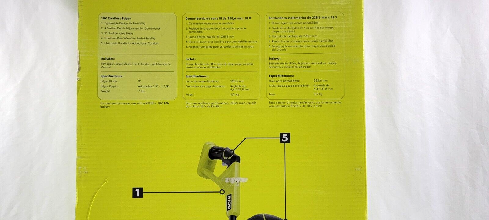 Enhance your RYOBI 18V ONE+ System with the 18V ONE+ Edger. The powerful motor allows you to achieve cleaner cuts and precise edges around driveways and sidewalks with extended runtime. Experience exceptional performance with just the pull of a trigger. Easily customize the depth of your cut with the 4-postioin single point depth adjustment ranging from 0.25” to 1.5”. The front and rear wheels allow you to have more control and ultimate stability when edging. Comfortably get the job done with the lightweight design and overmold handle. includes P2300 18V Edger, 9" Edger Blade, Front Handle, and Operator’s Manual. Battery and charger sold separately.