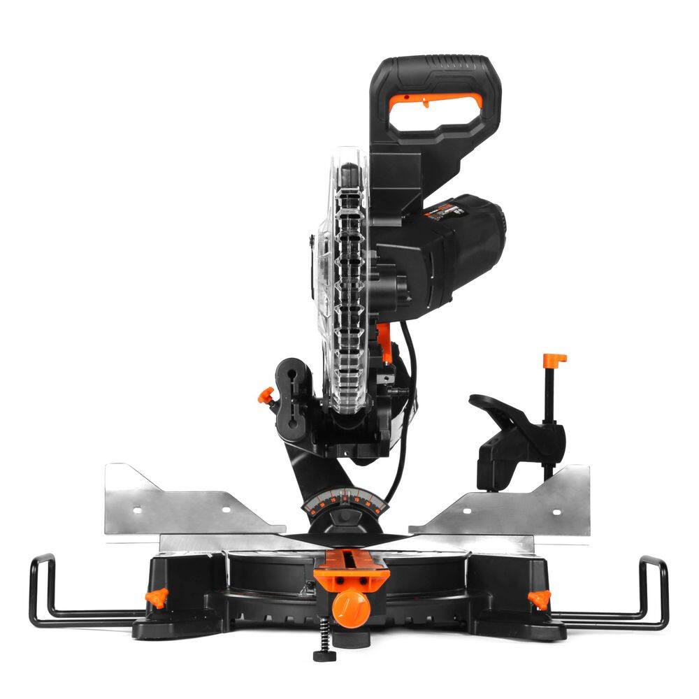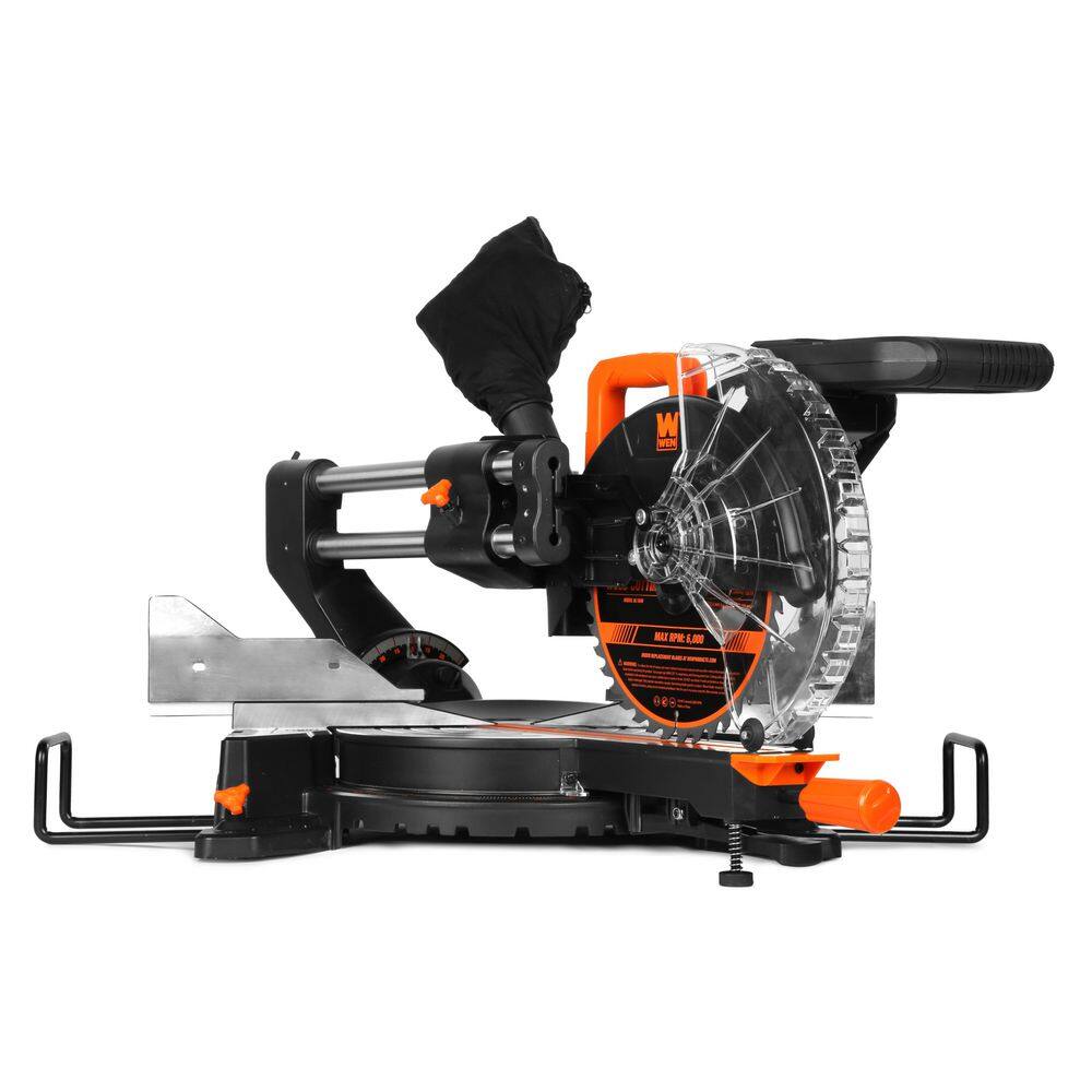 Create cuts at any angle with the WEN 10 in. Dual Bevel Sliding Compound Miter Saw. Our powerful 15 AMP motor slices through even the hardest of woods, providing 5000 blade rotations per minute. This versatile saw bevels up to 45° in either direction and miters up to 49° in either direction, with a front bevel control for fast and easy adjustment. Cut boards up to 12 in. W and 3.75 in. thick or make compound cuts (45° bevel and 45° miter) in boards up to 8.5 in. W and 2.6 in. thick. The saw features 9 miter stops: 2 at 15°, 2 at 22.5°, 2 at 31.6°, 2 at 45° and 2 at 0. However, if a more unique angle is preferred, the miter lock still allows the saw to lock at any angle between those stops. The onboard LED cutline guide casts a shadow against the blade to illuminate your line of cut for maximum accuracy while the dust collection port allows for connection to either the included dust bag or your dust collection device of choice. This spacious saw also features a 5.5 in. crown molding nested capacity and a 3.5 in. base board vertical capacity. This package includes a 40-tooth carbide-tipped blade with a 5/8 in. arbor (model BL1040), 2 adjustable support fences, one quick-clamp assembly, a dust port, a dust bag and a carrying handle.